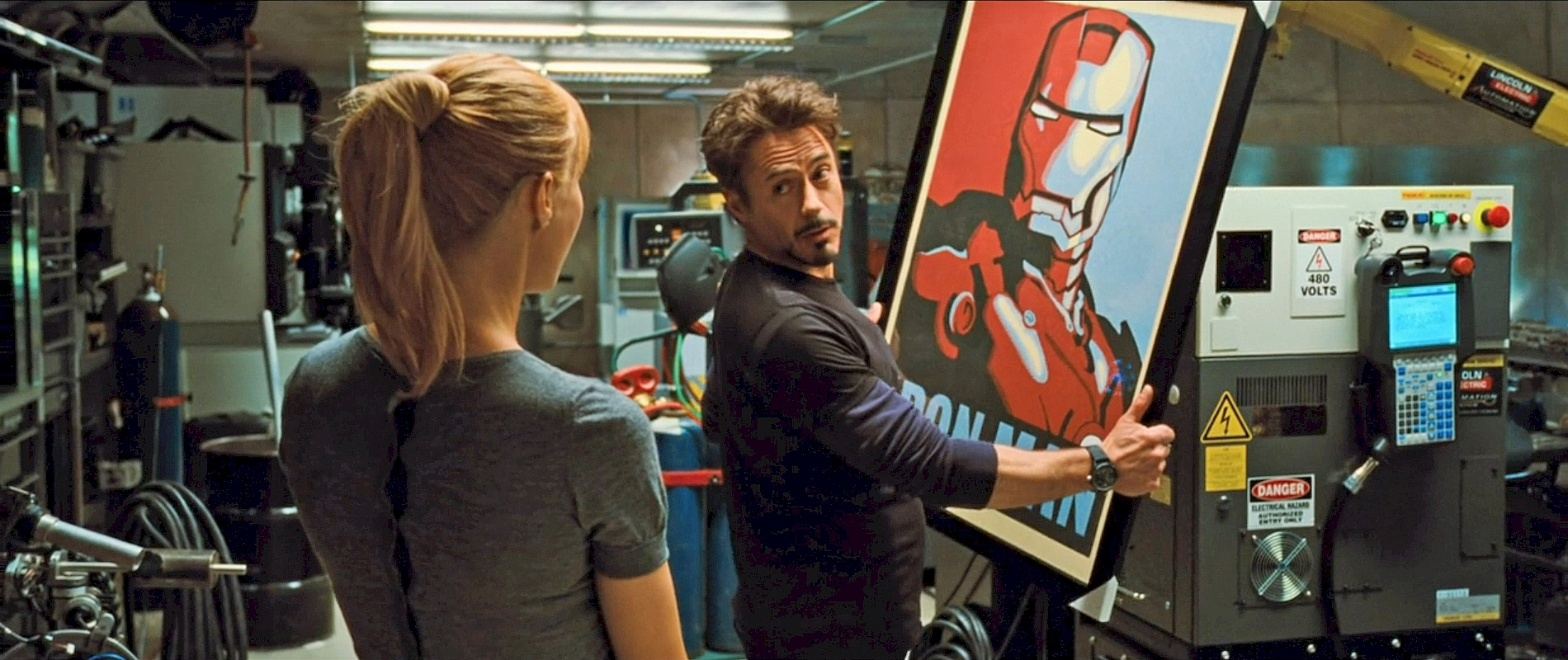 This large framed artwork was created in 2009 for "Iron Man 2" (2010) by graphic designer Monica Fedrick (1969-) based on an initial pencil sketch by graphic assistant Fiona Neale (1954-). This was under the supervision of assistant art director Page Buckner (1979-) under production designer J. Michael Riva (1948-2012) with permission from Shepard Fairey (1970-) since it was based on his famous poster of President Barack Obama (1961-).