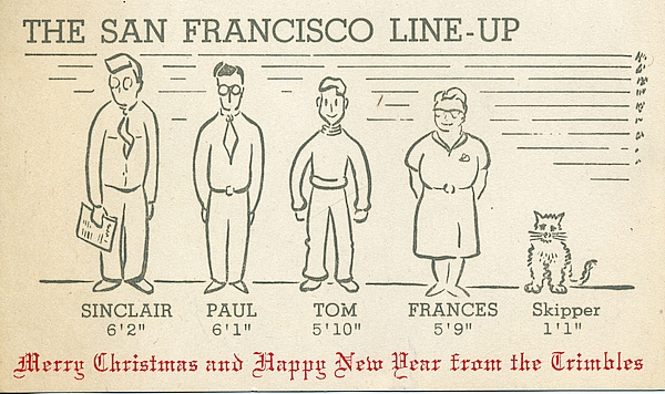 Sketched by Oliver Bassett, this was the final draft of the 1960-1961 holiday card by the Castelhun-Trimble family. From left to right: Sinclair G. Trimble, Paul C. Trimble, Thomas E. Trimble, Frances C. Trimble, and Skipper the cat. See the first draft here. And the final card here.